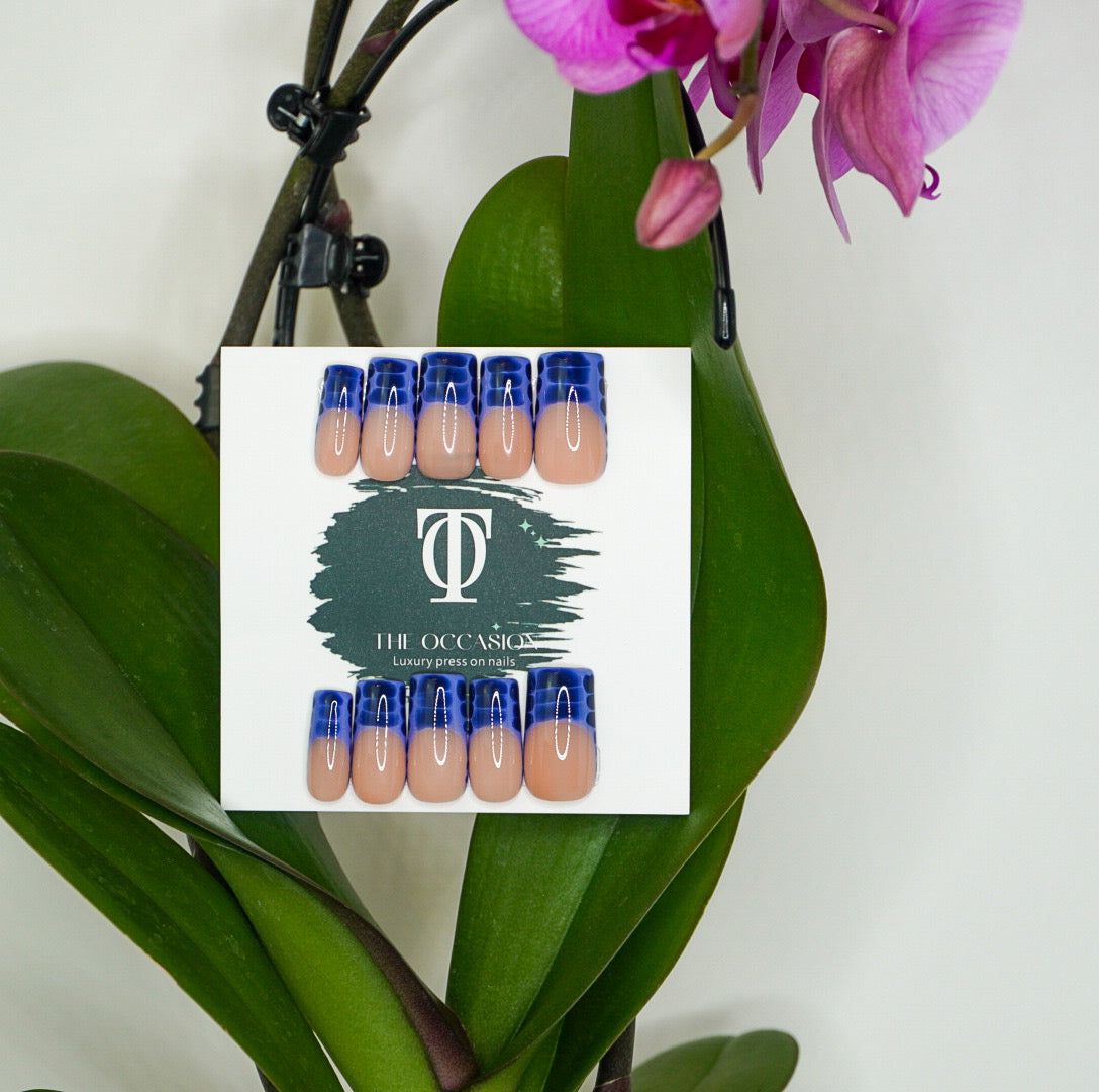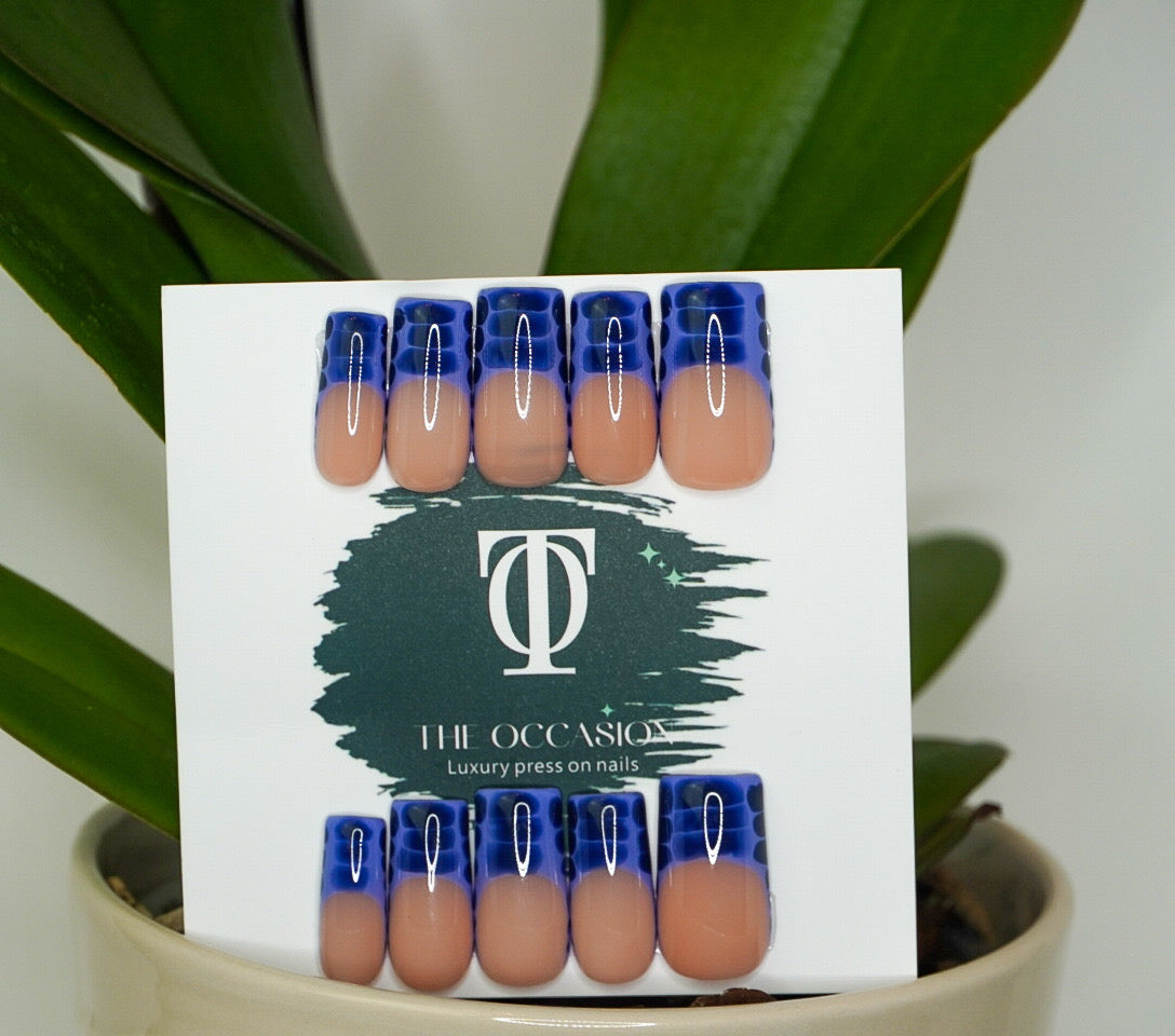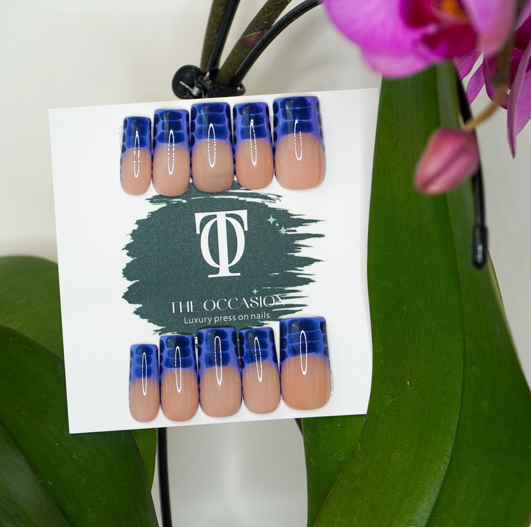 Step into elevated style with these short square press-on nails, featuring a soft blush nude French tip paired with a bold navy blue base. A rich dark blue square overlay adds depth and creates a chic croc-textured effect, giving this set a modern, edgy twist on classic French nails.