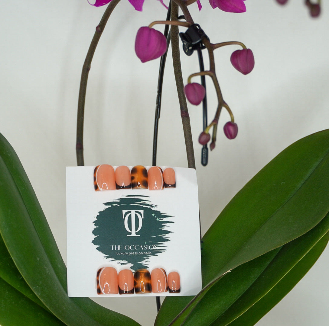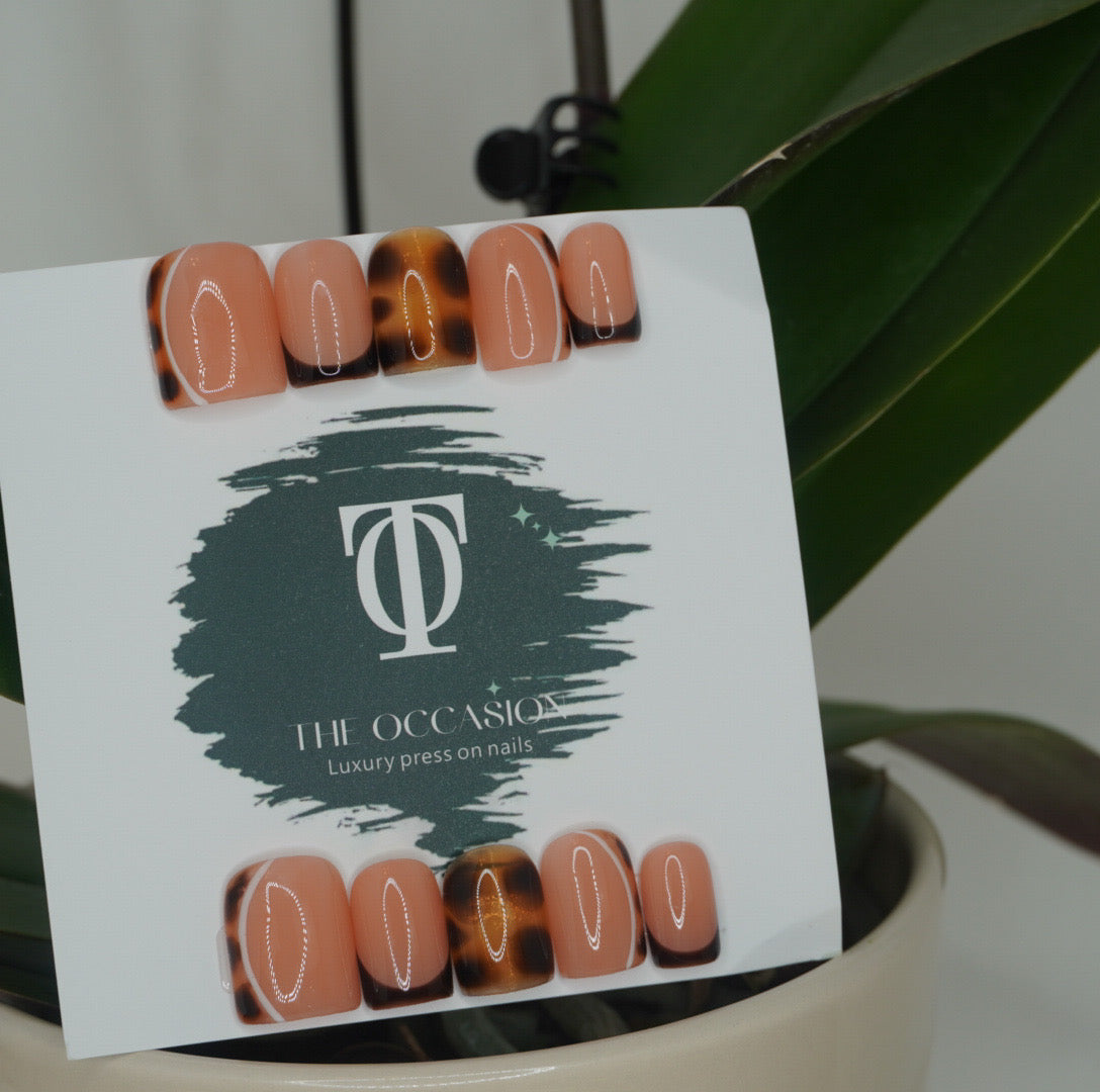 Elevate your nail game with these short square press-on nails featuring a chic nude blush base with artistic details. This unique set includes two accent nails with curved white line tortoise trim, two rich brown French tips with a nude blush base, and one bold tortoise-patterned nail for a modern, fashion-forward look.