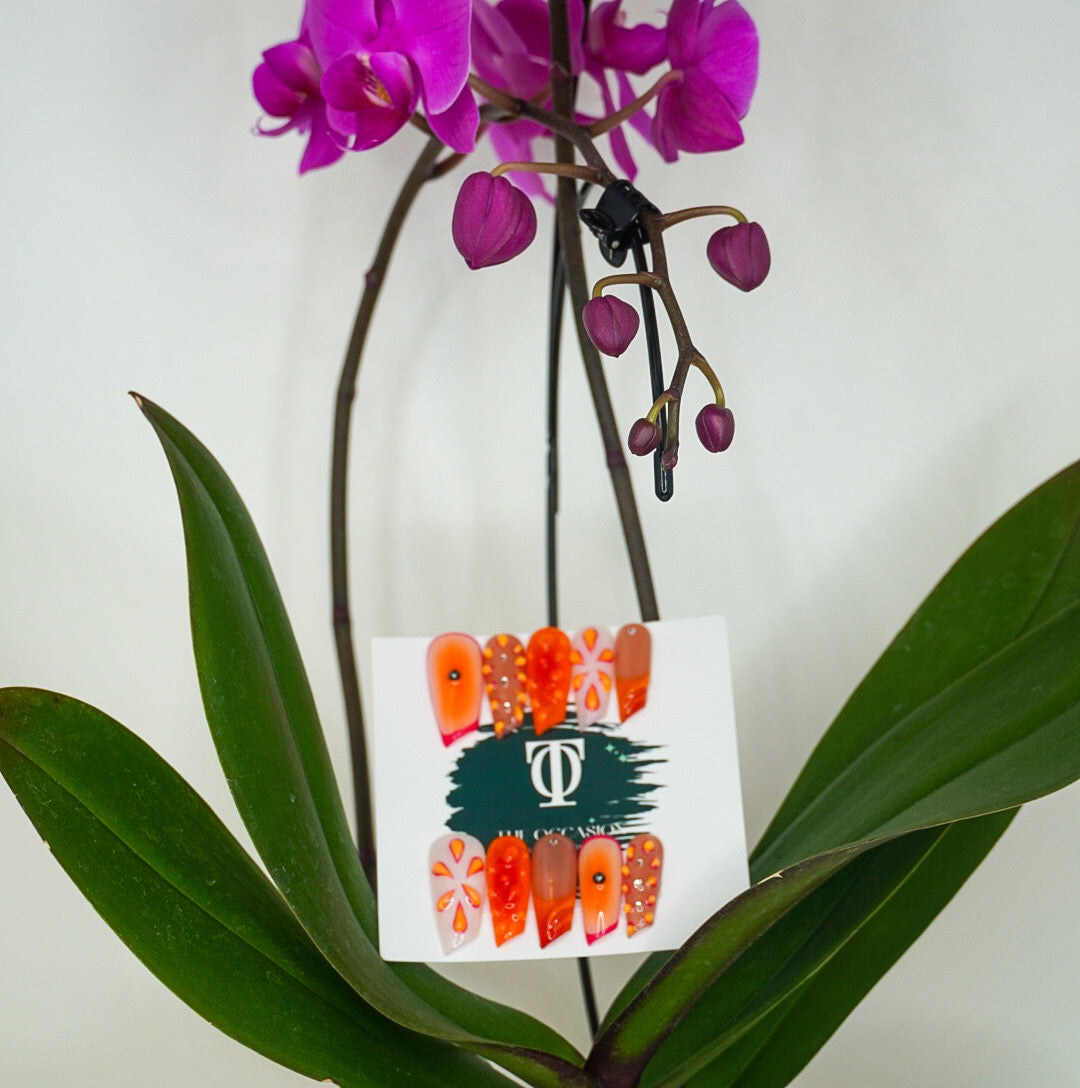 Style: Nude, White & Orange Bases with 3D Droplets, Red-Pink Accents & Rhinestone Detail