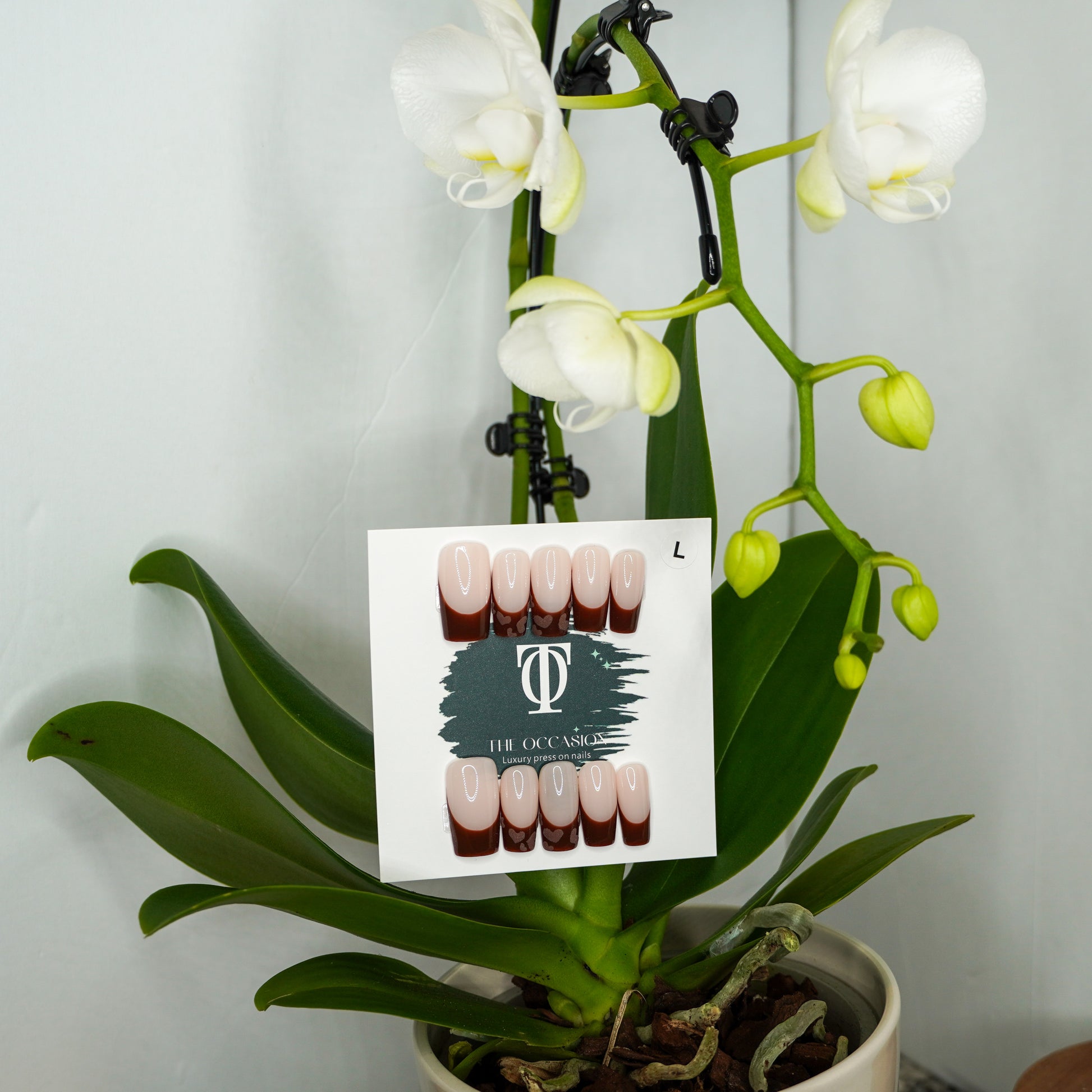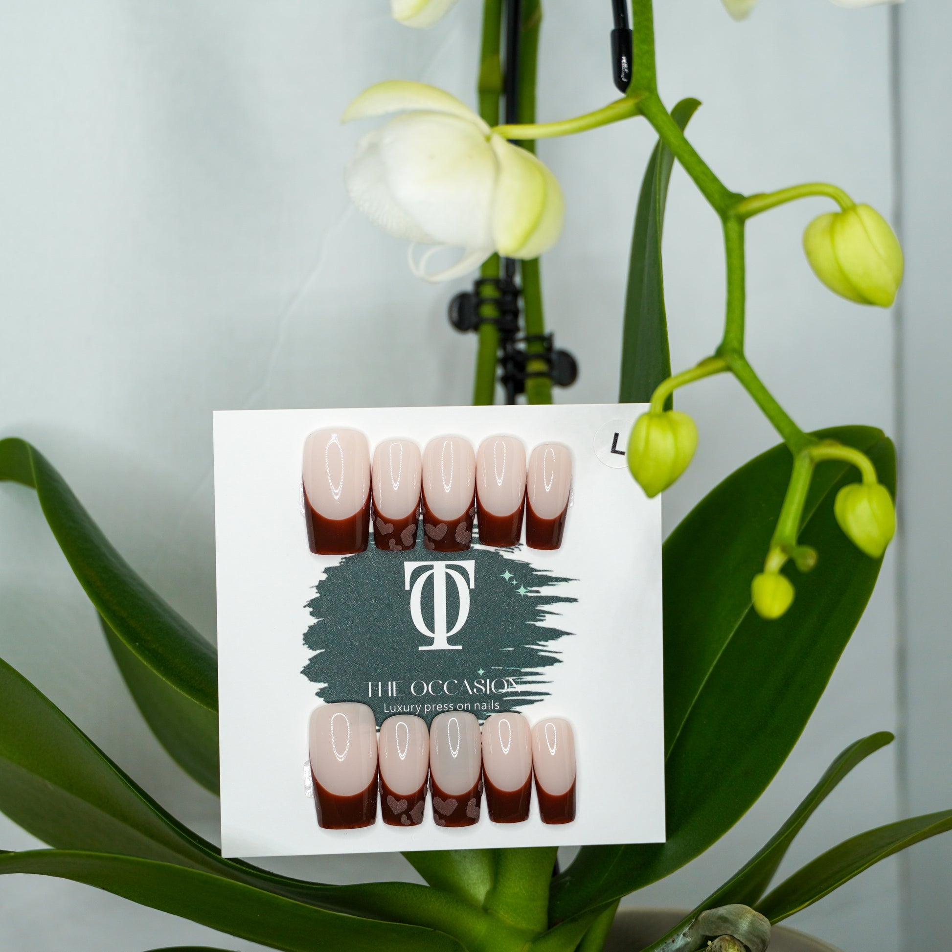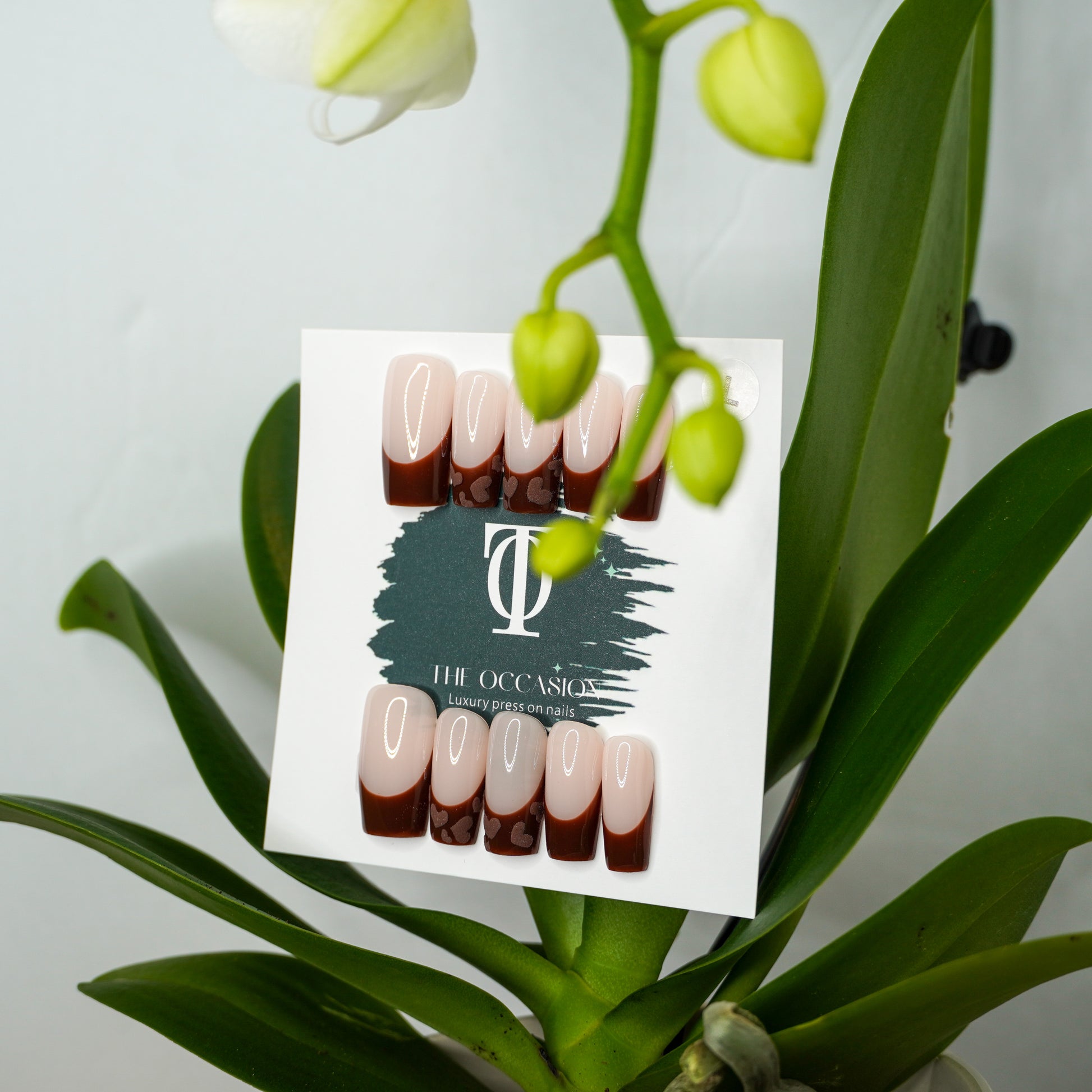 A modern twist on a timeless classic. This elegant set features a crisp square French base with rich brown tips, accented by two statement nails adorned with tiny brown heart details. Subtle, chic, and undeniably romantic—perfect for everyday wear or soft glam moments.