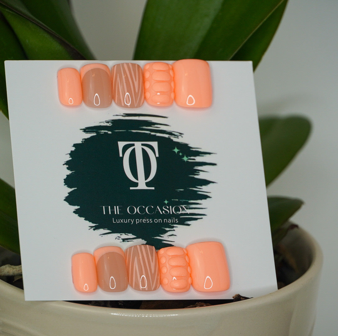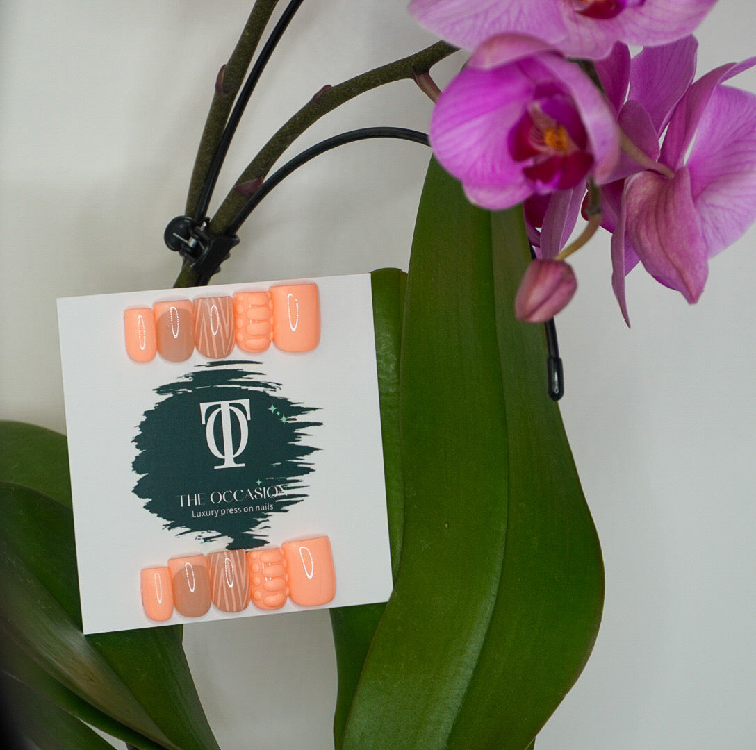 Make a bold, modern statement with this short square press-on nail set, designed in warm coral orange tones paired with nude accents. The set features: