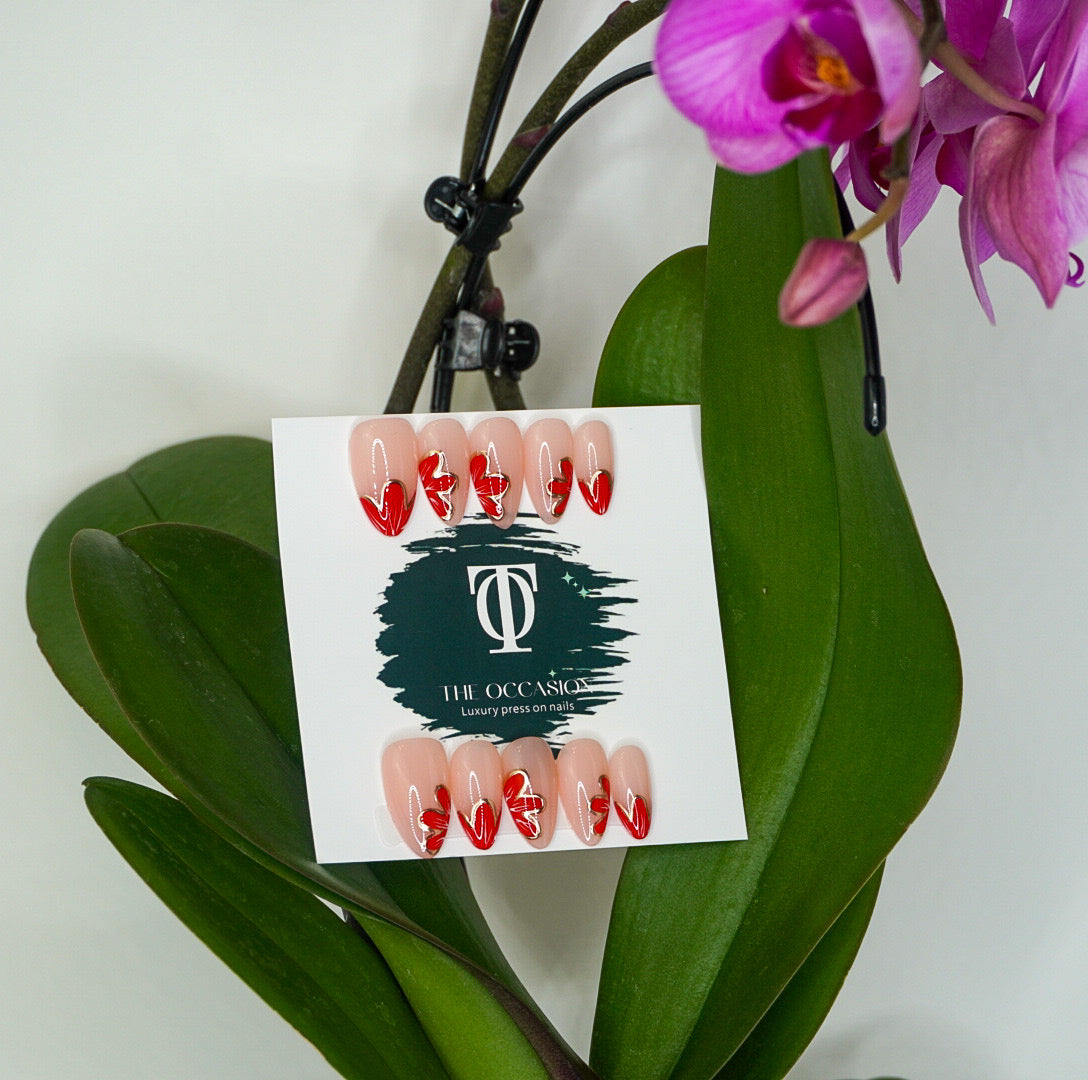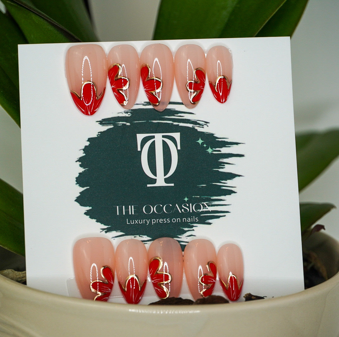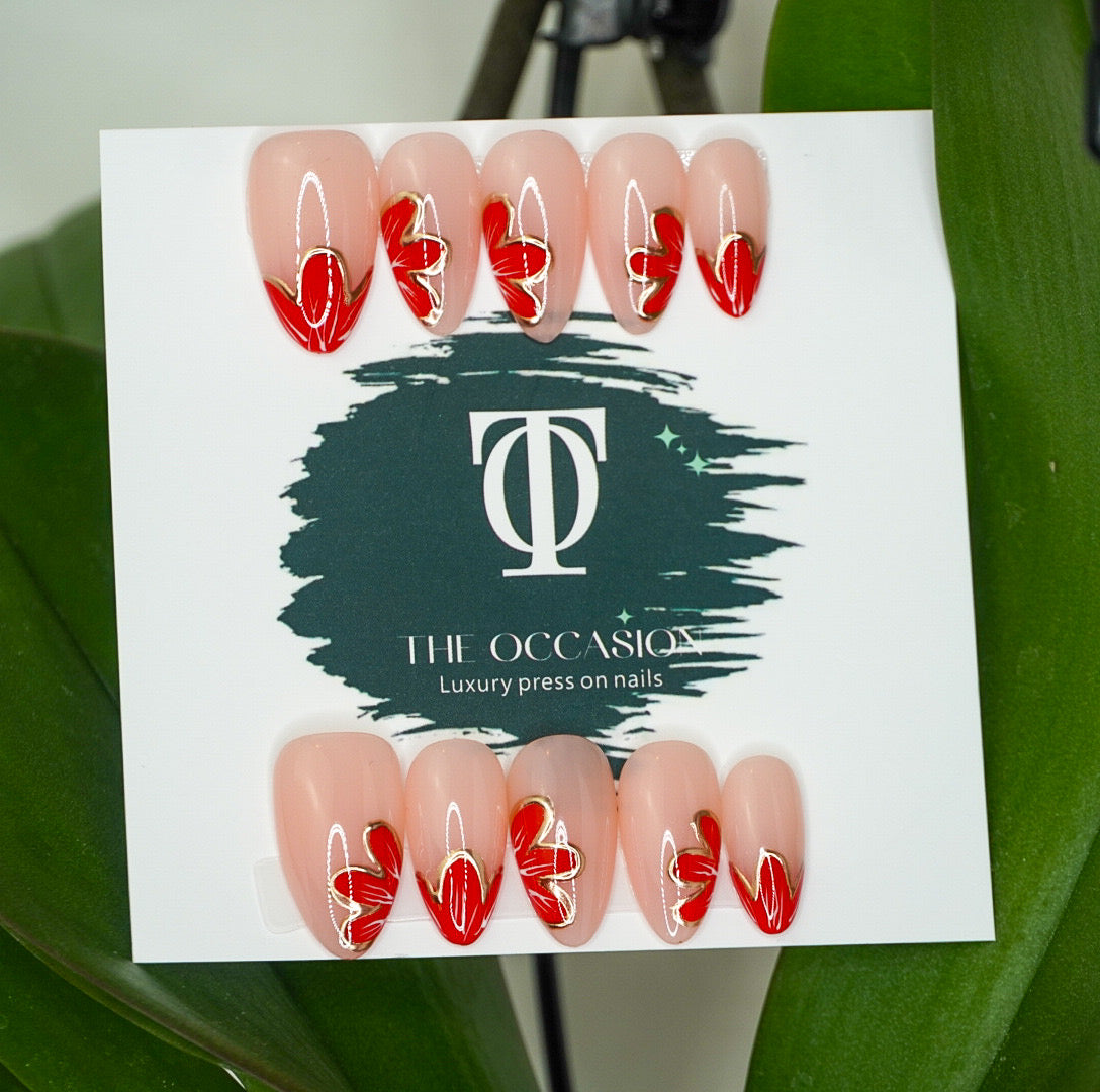 Style: Solid Nude Base with Red Flowers & Gold-Tipped Petals