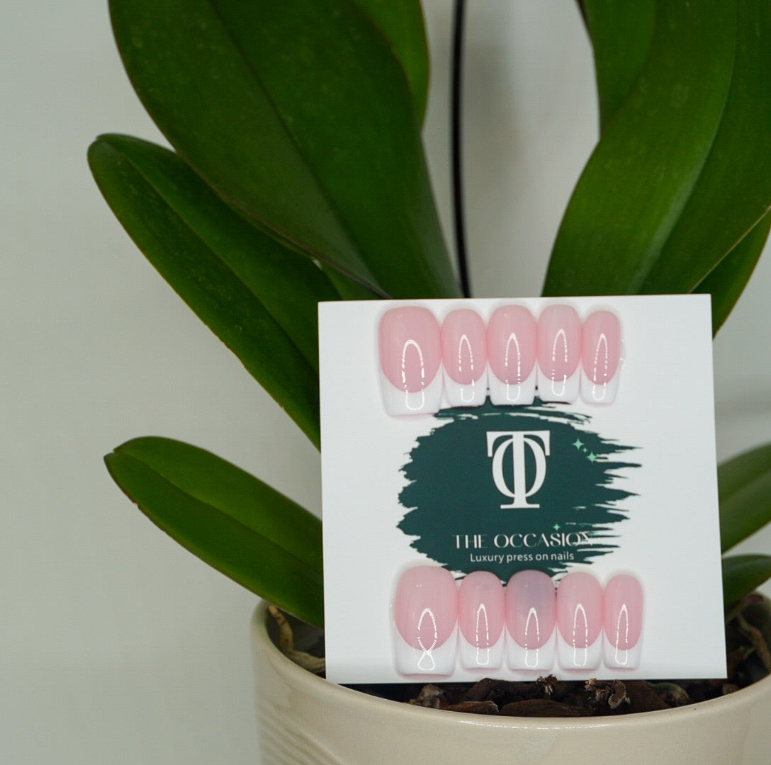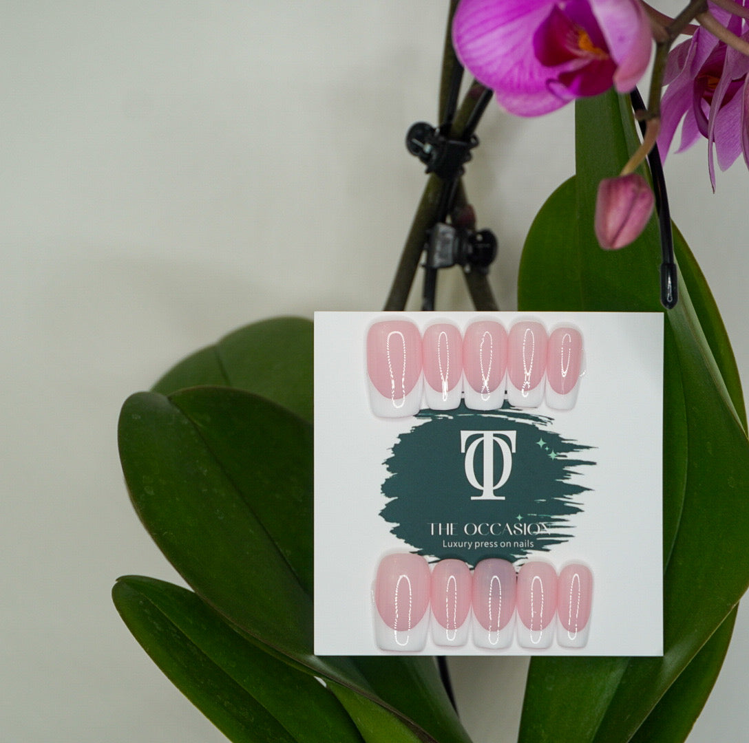Mid-length square press-on nail set features the iconic French tip design—a soft nude base paired with crisp white tips for a clean, polished look. This style is perfect for weddings, work, brunch, or everyday wear that never goes out of fashion.