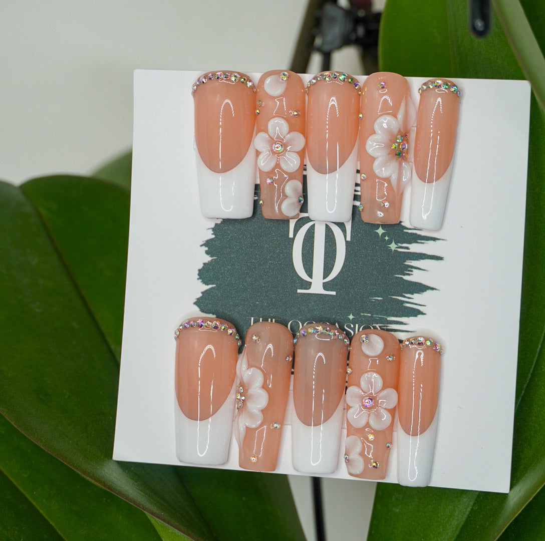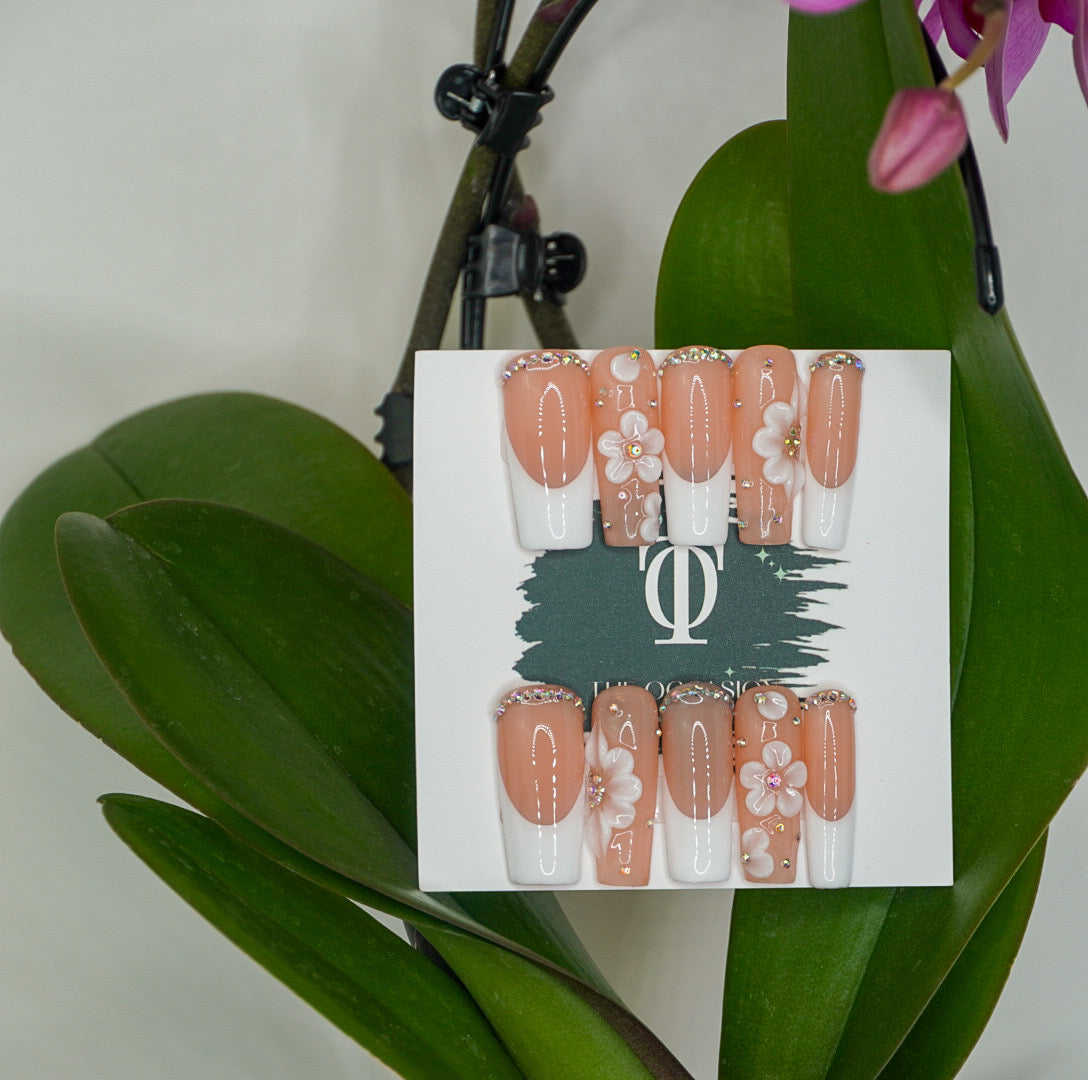Style: Nude French Tips with Diamond Crests & 3D Flower Embellishments\