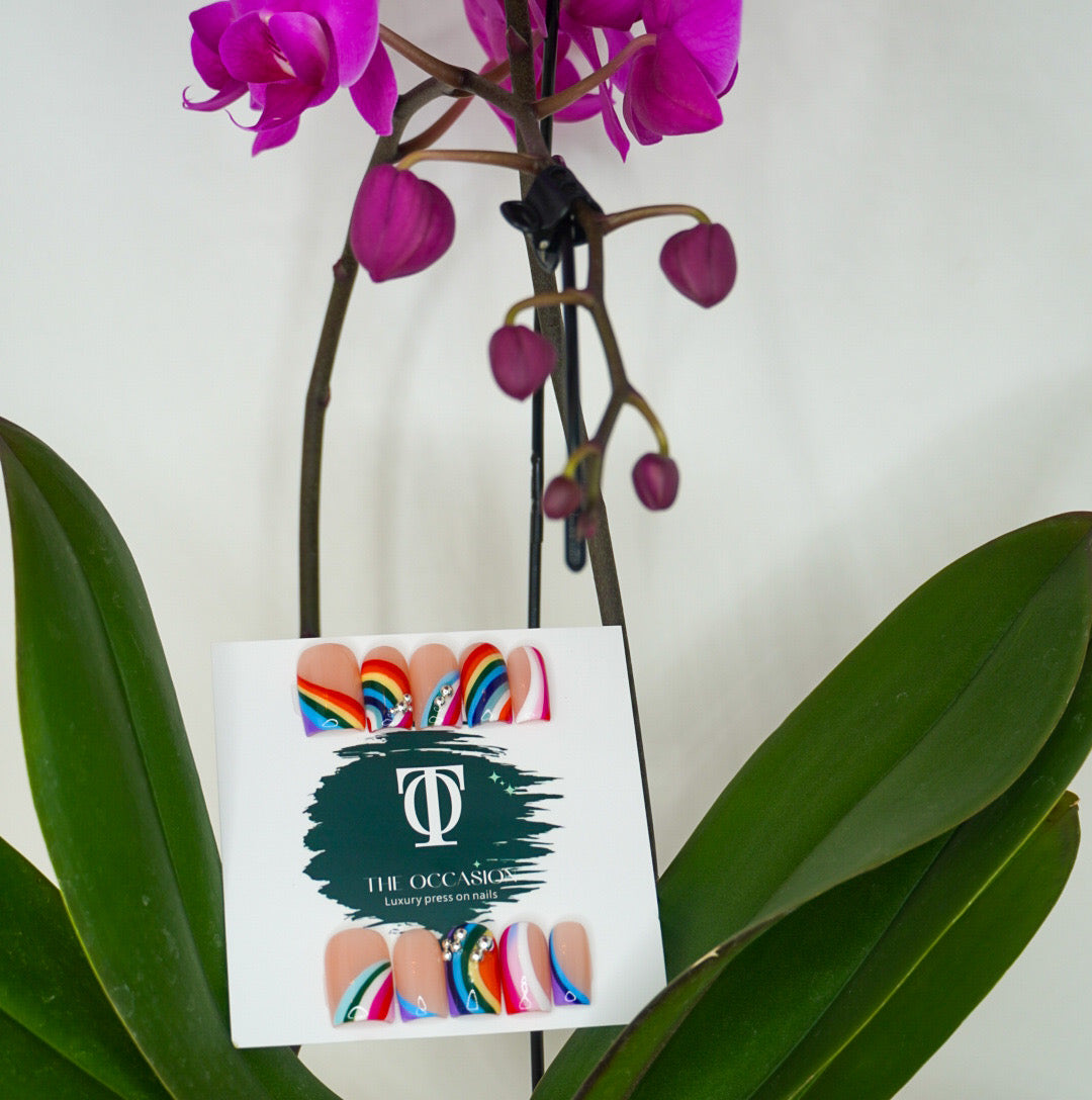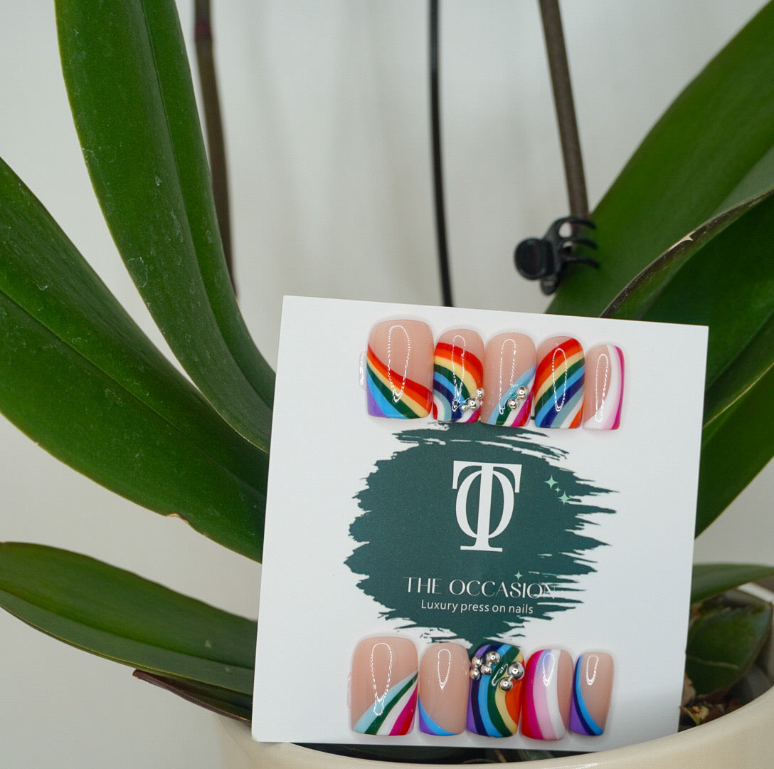 Short square press-on nail set, featuring a clean nude base and a playful horizontal rainbow stripe across each nail. The multicolor line adds a trendy, minimalist vibe perfect for pride season, summer days, or simply celebrating color in your everyday look.