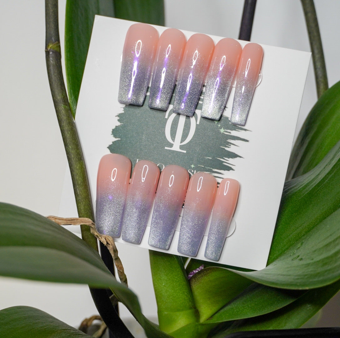 Long square nails with chrome omber finish