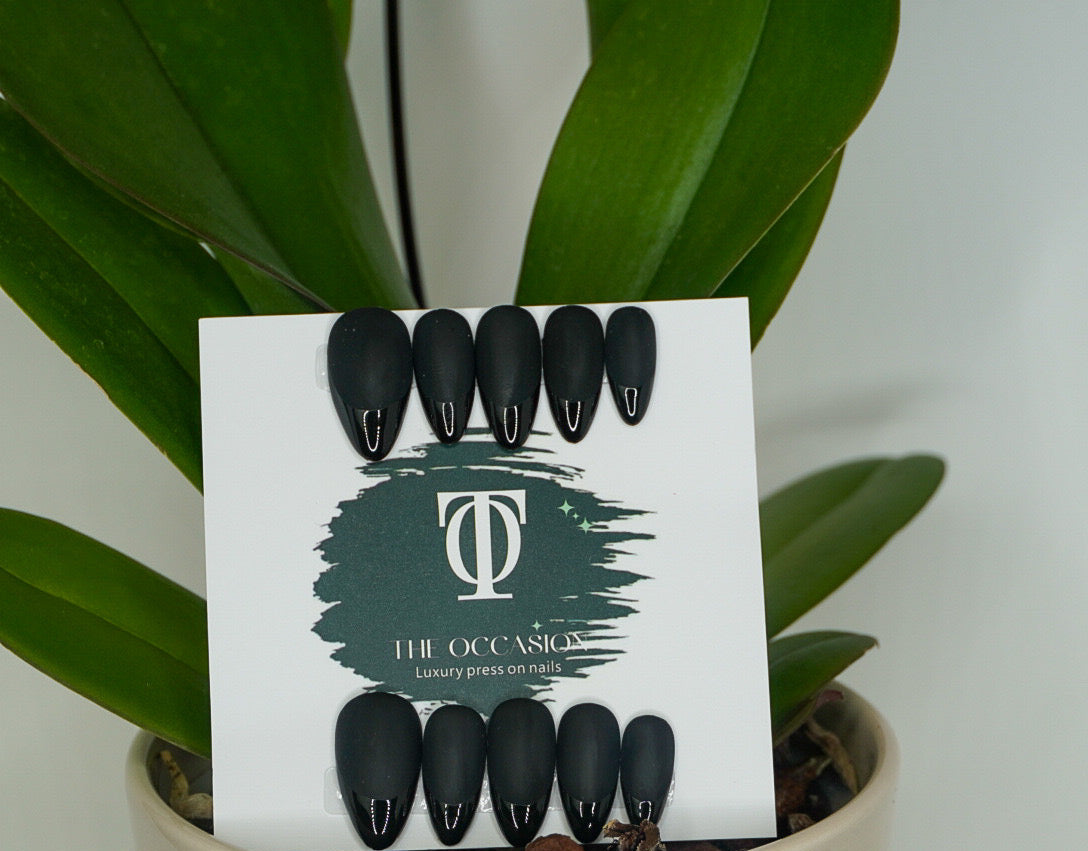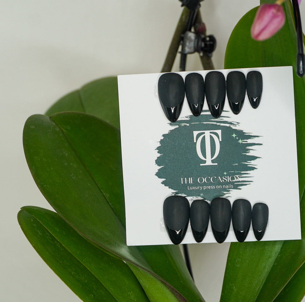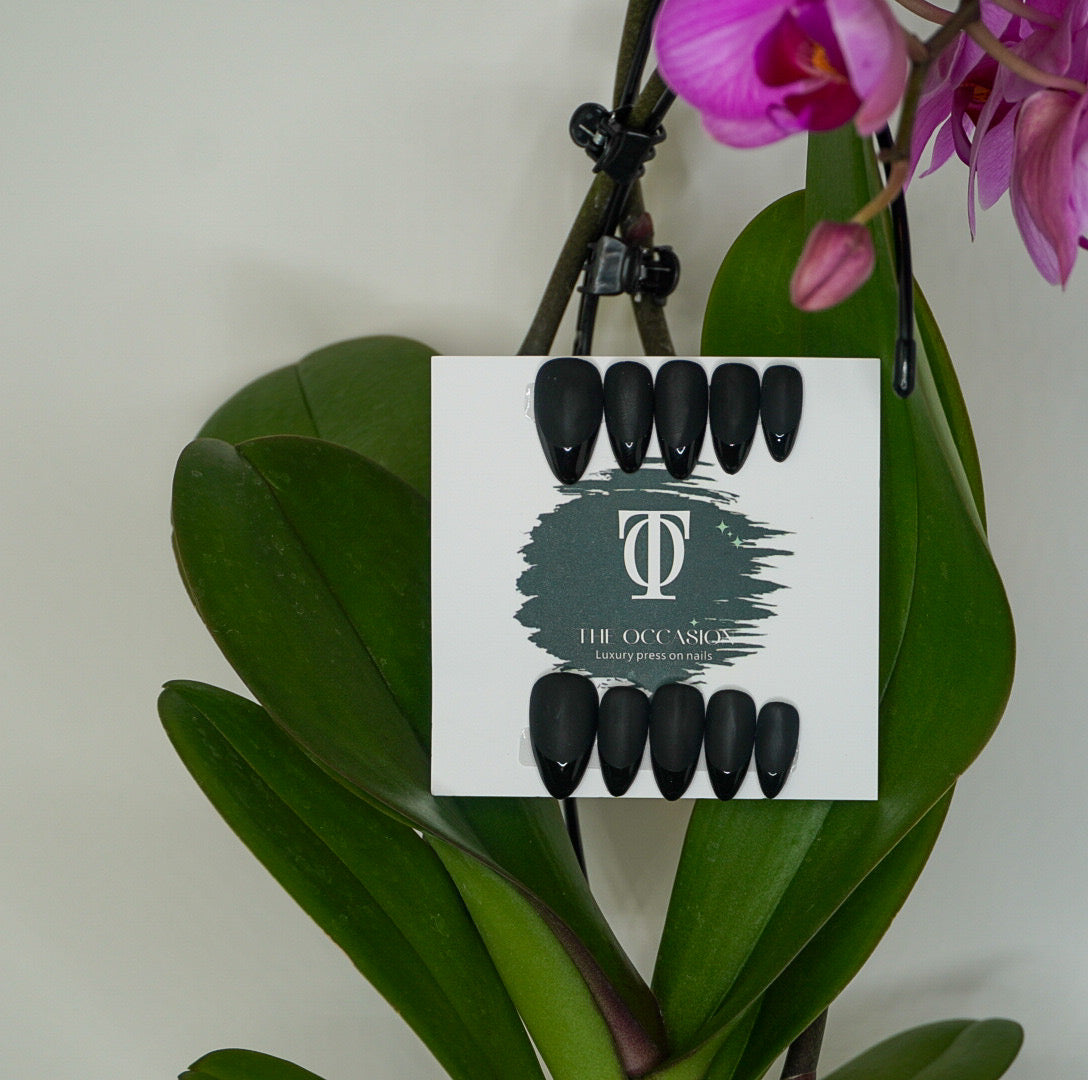 Mid-length almond press-on nails featuring a bold matte black base and high-gloss black tips for a striking contrast. This edgy yet elegant set brings a modern twist to a classic French style, perfect for evening events, fashion-forward looks, or everyday glam.
