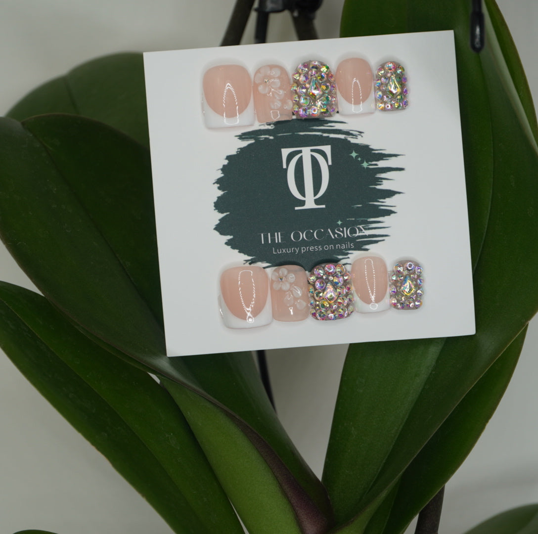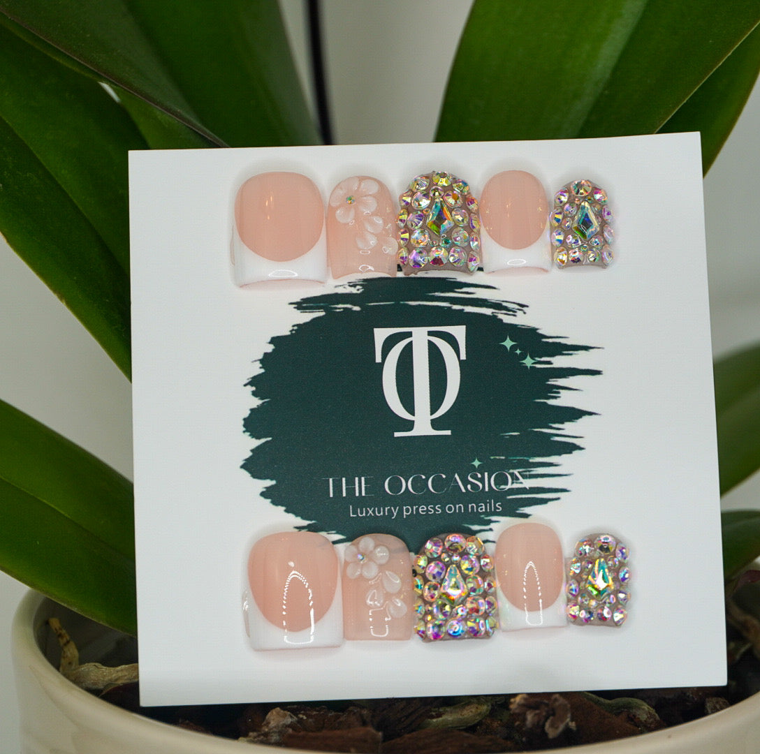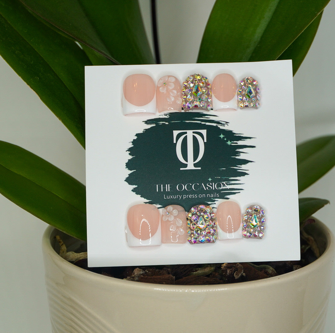 Square nails includes 3Dflowers and accent rhinestones covered nails and French design