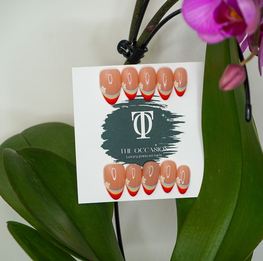 Brighten up your manicure with these short almond press-on nails, featuring a soft natural pink base and playful rainbow tips. Each set includes a charming floral accent design at the tip, combining fun, color, and elegance—perfect for spring, festivals, or adding joy to your everyday look.