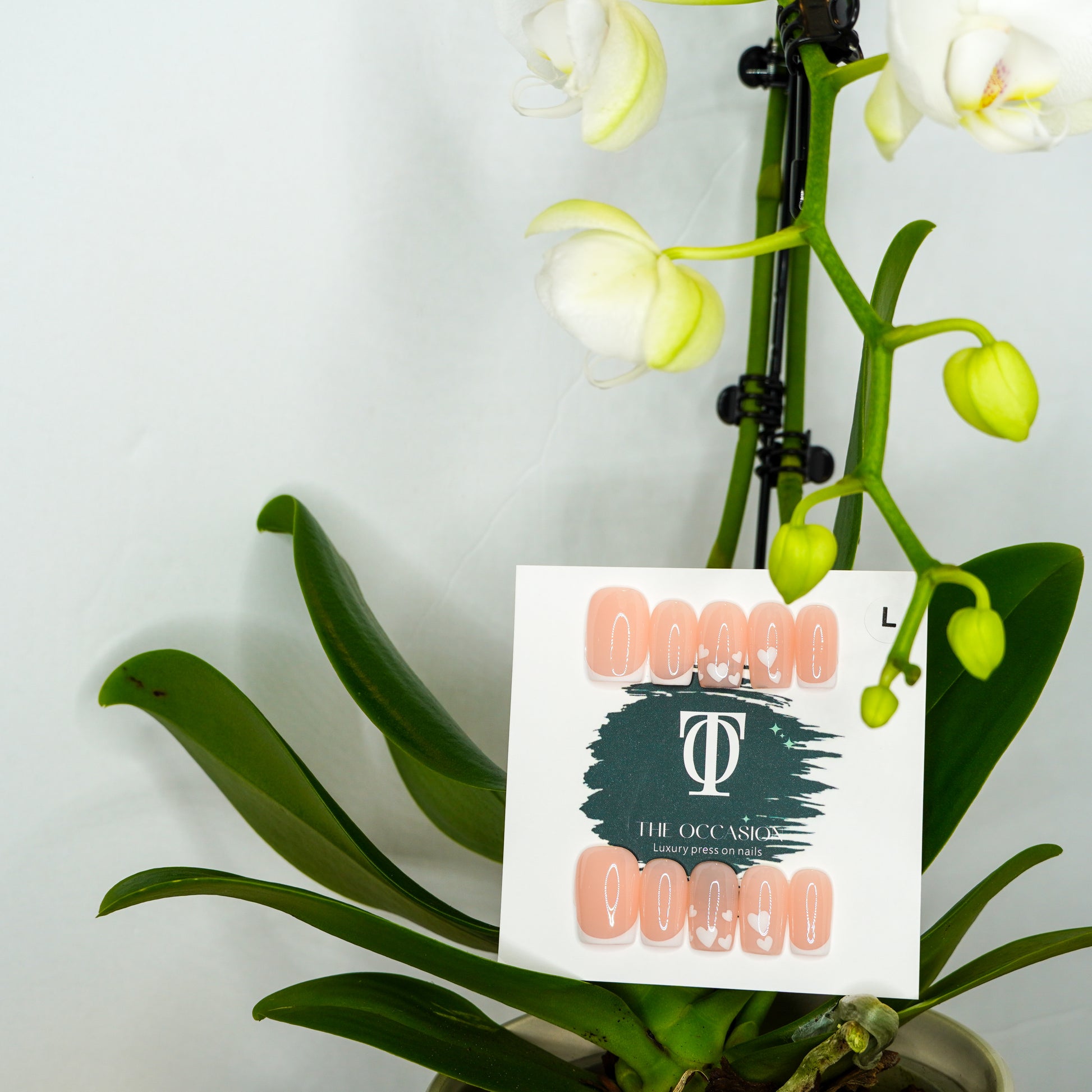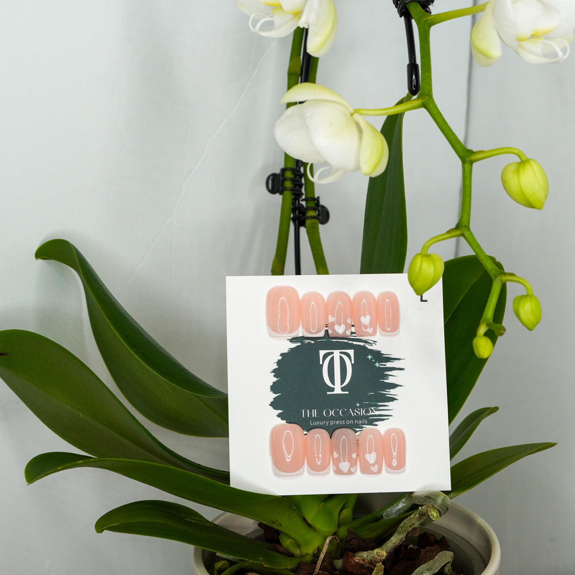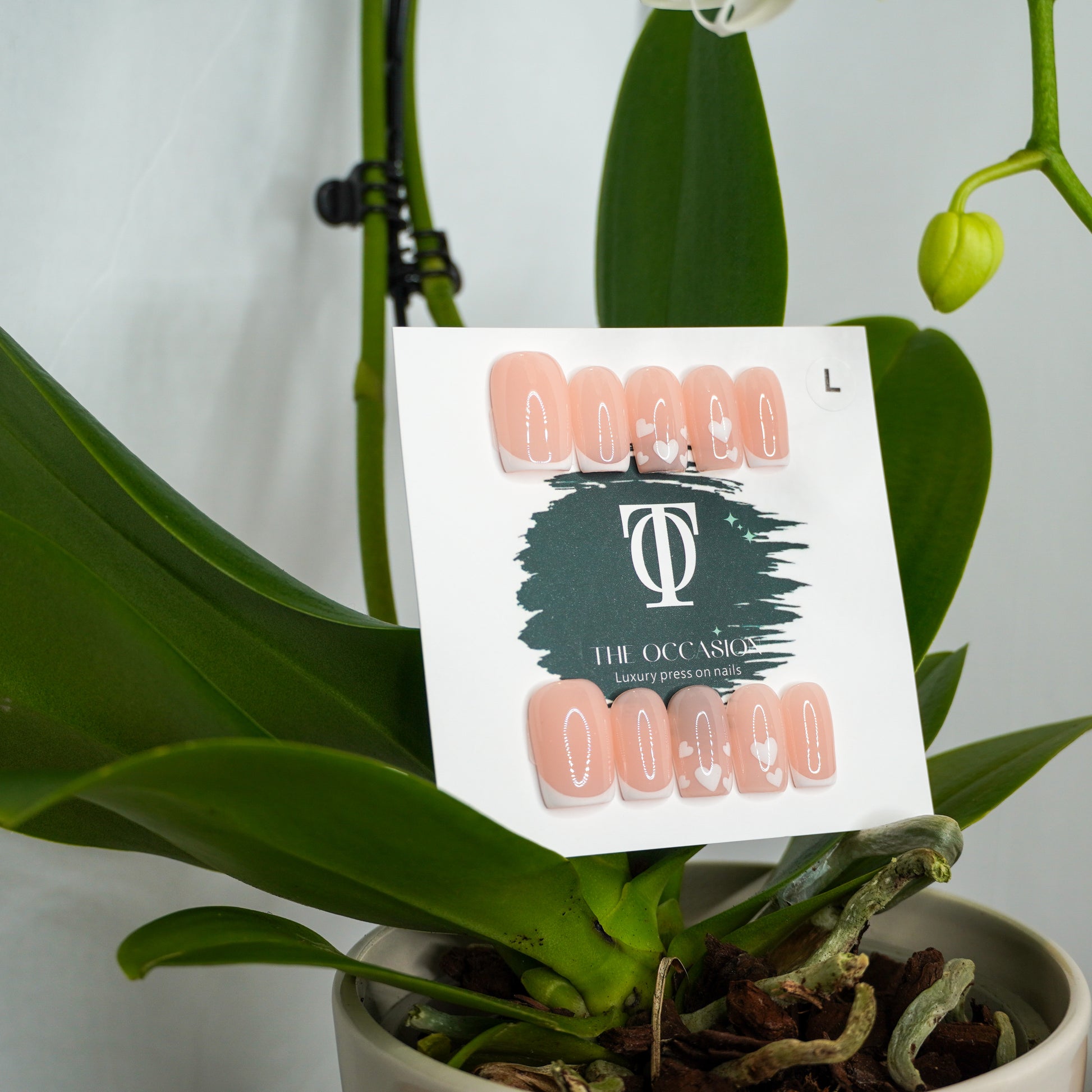 A timeless French tip with a playful romantic twist. This medium square set features a soft nude base with classic French tips, paired with two accent nails detailed with tiny heart designs cascading up and down the nail. Elegant yet fun, this set is perfect for everyday wear, date nights, or subtle statement moments.