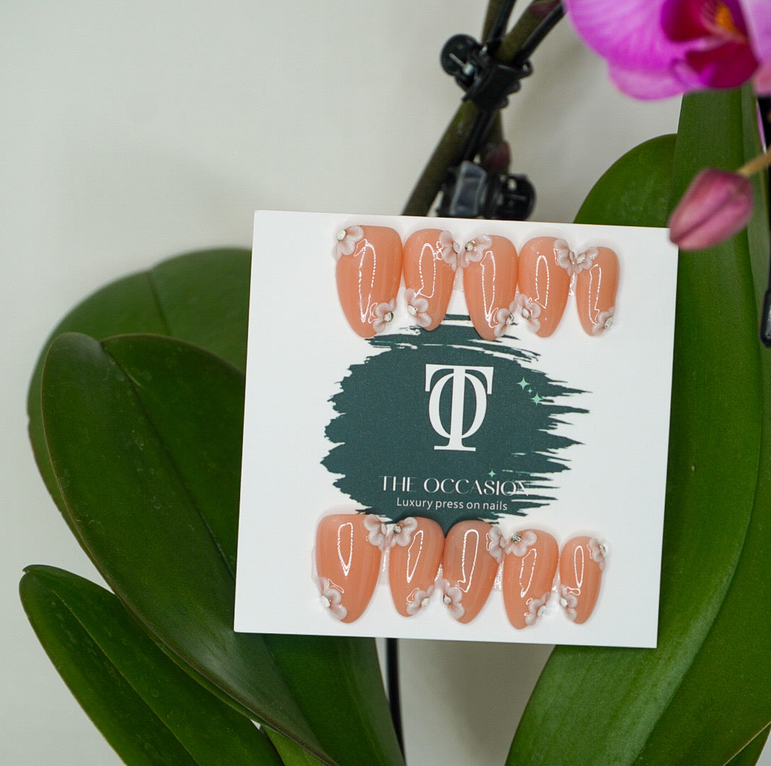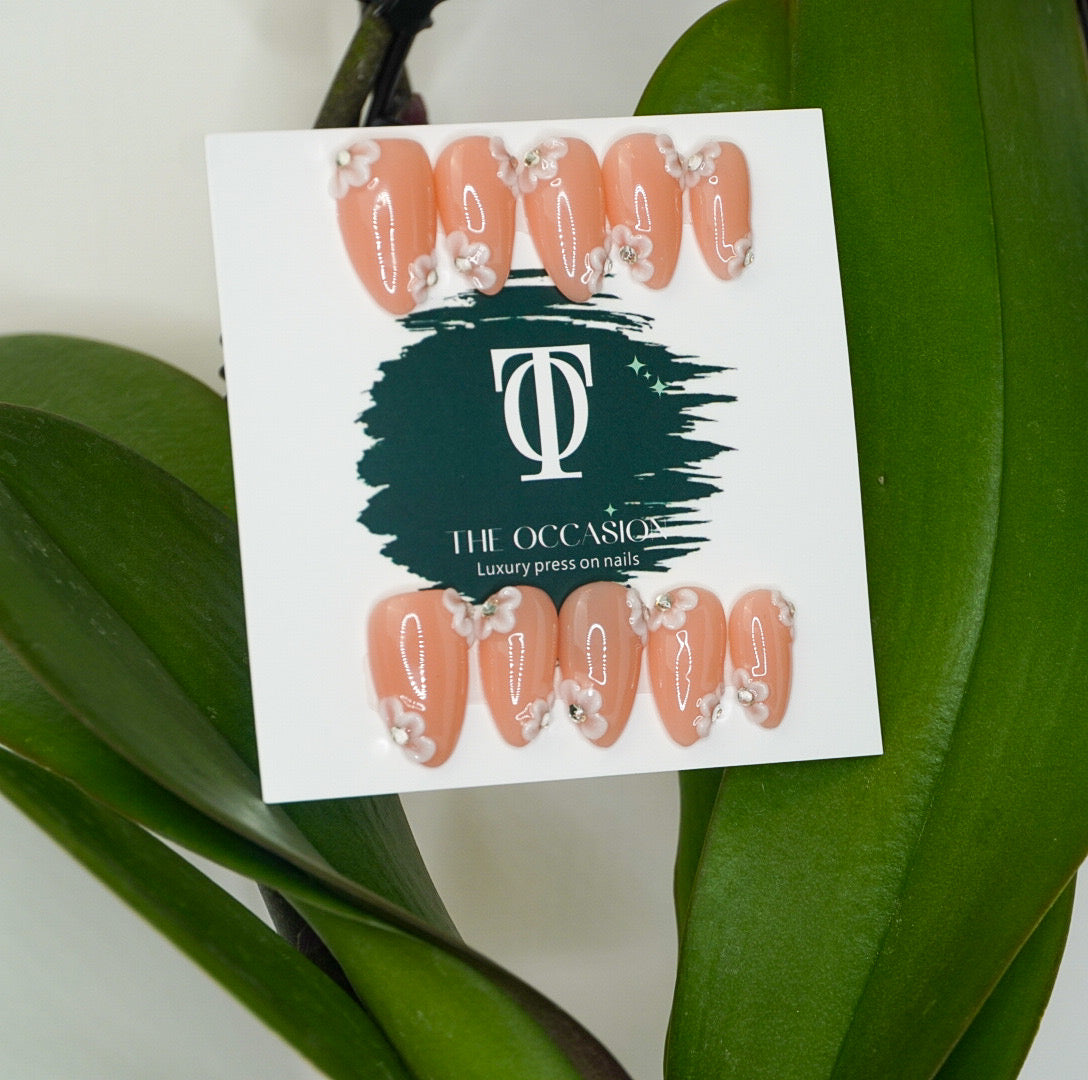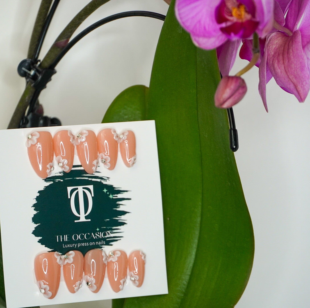 Short almond press-on nails featuring a soft blush nude base and hand-painted 3D white flowers accented with sparkling diamond centers. Each floral detail is thoughtfully placed at the tip and edges, creating a delicate, feminine, and timeless design.