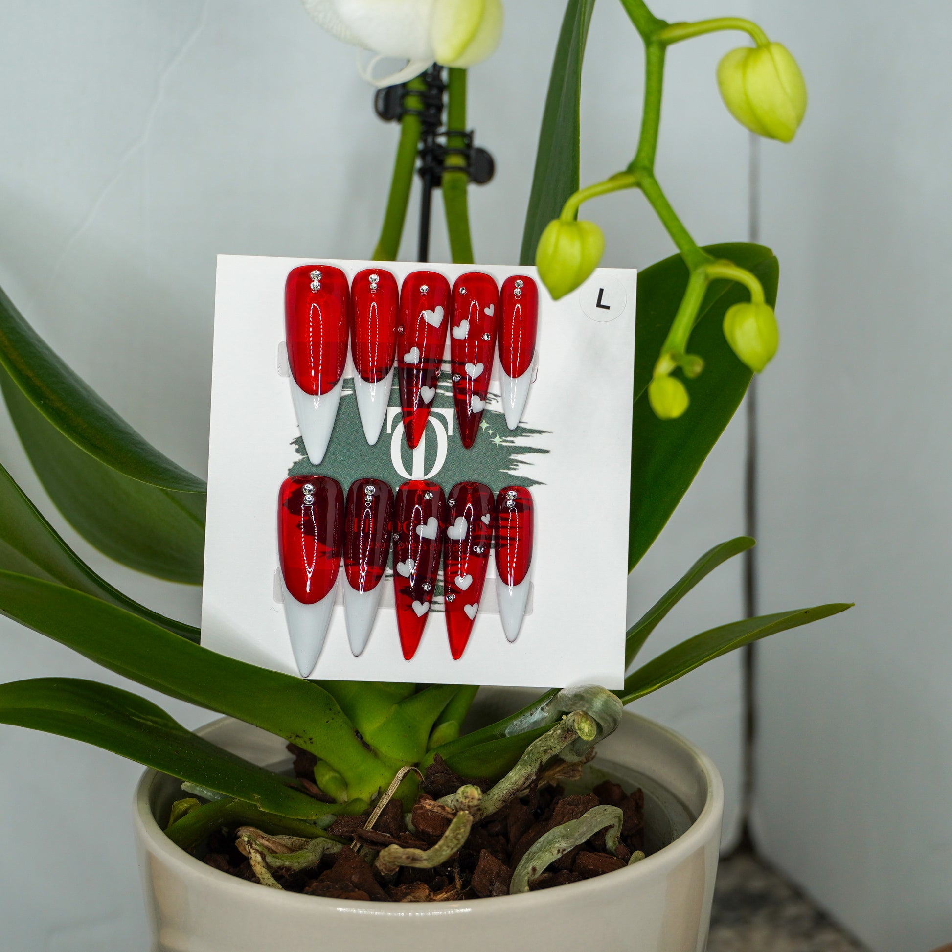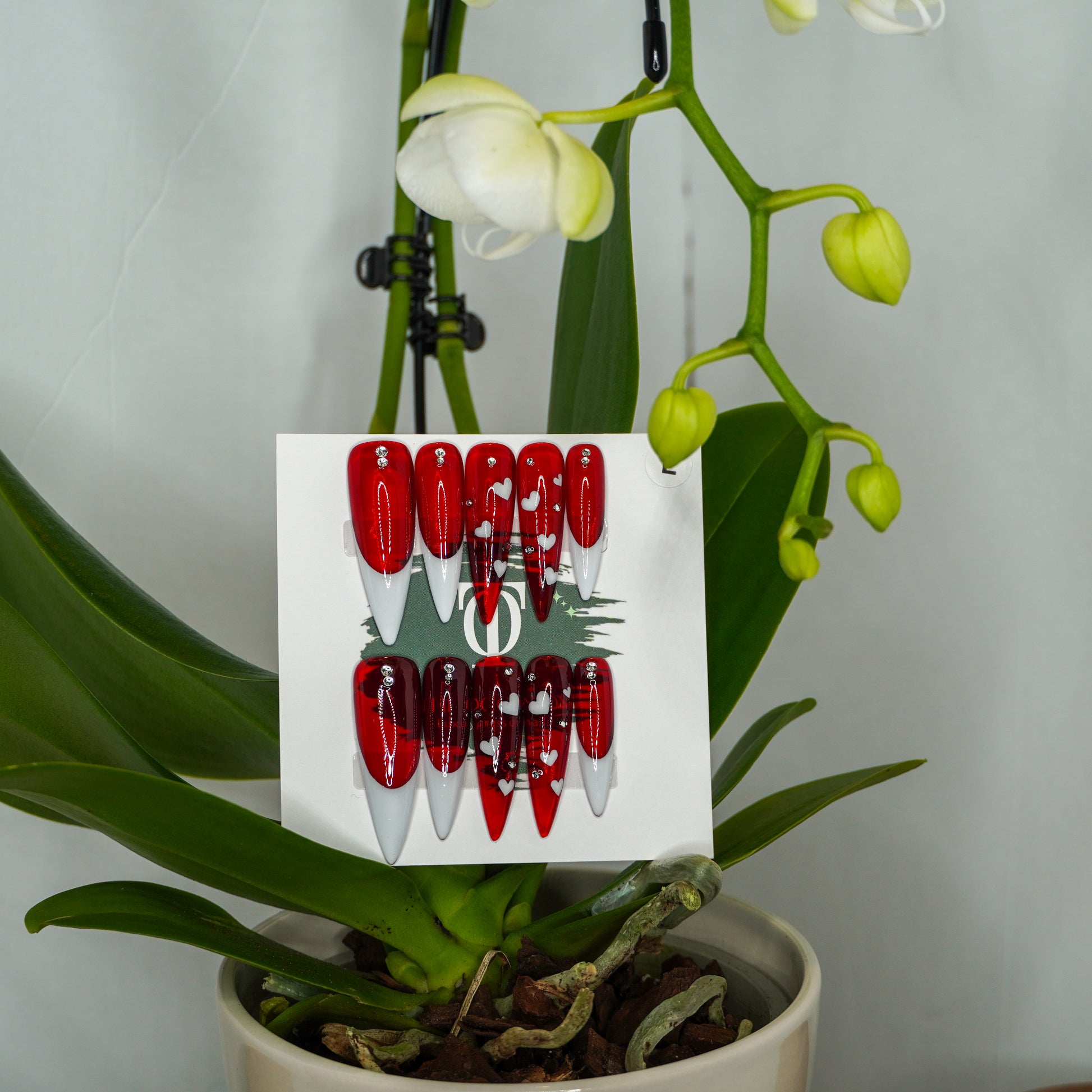 Dramatic, glamorous, and made to shine. This long stiletto set features a bold red French tip design with sparkling diamond accents at the cuticle, paired with two statement accent nails in a full red base adorned with cascading white heart details and crystal embellishments. Designed to turn heads, this set is perfect for Valentine’s Day, date nights, or any moment you want full glam.