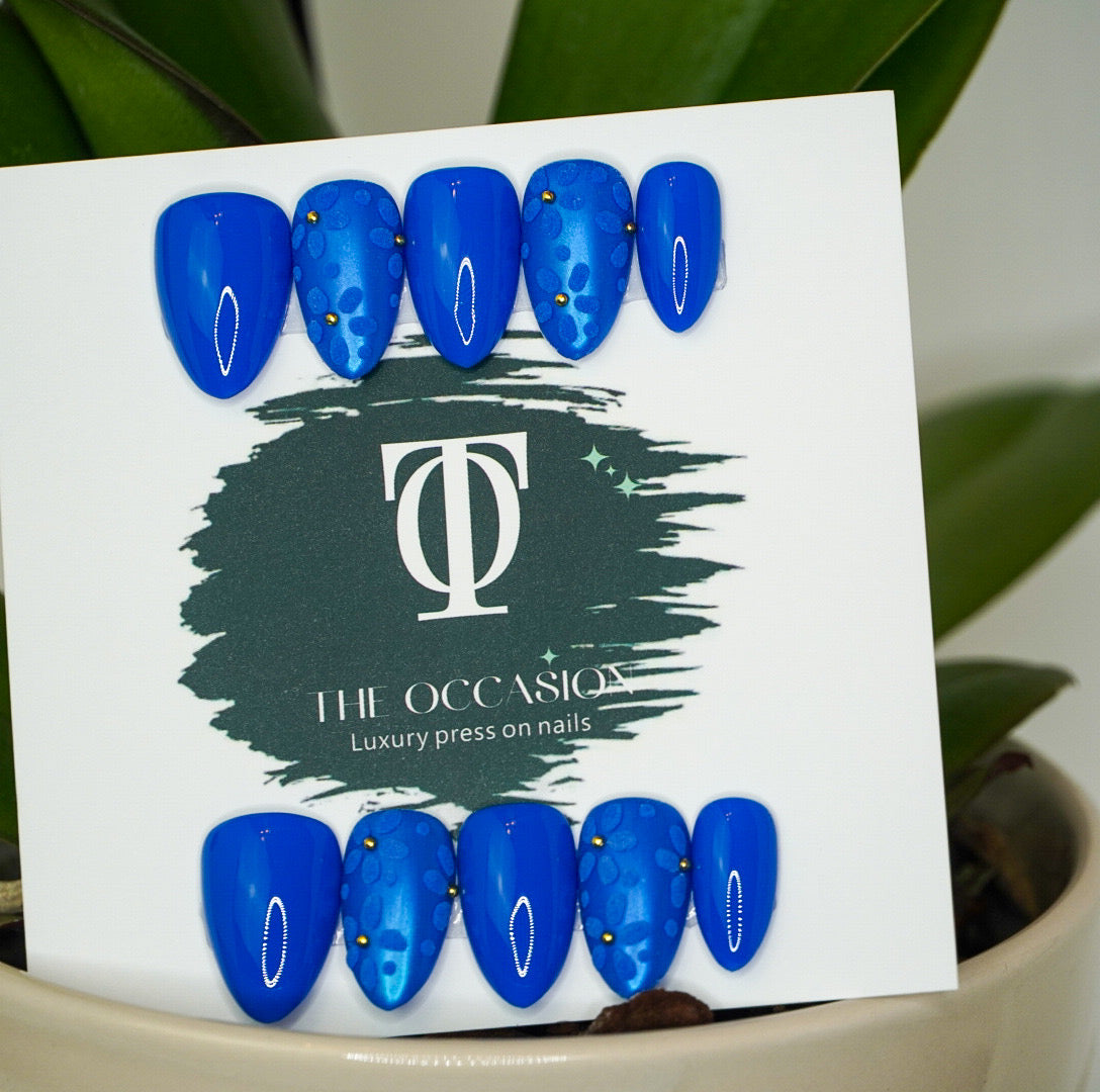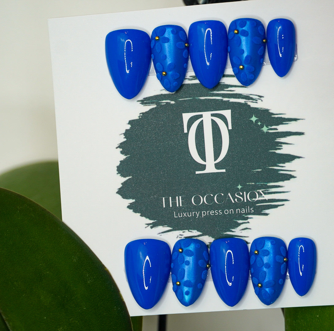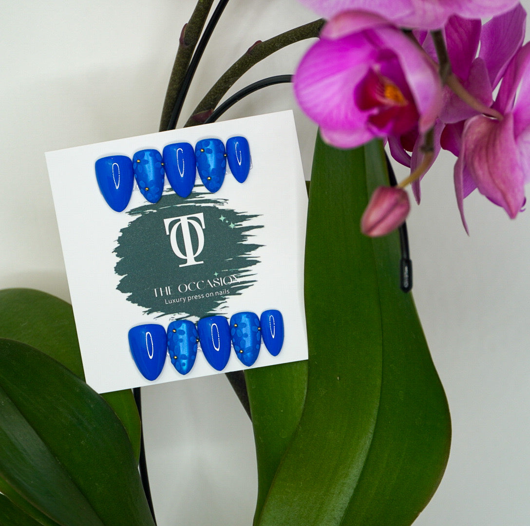 Chic and sophisticated, these short almond press-on nails feature a rich monochromatic blue base fully adorned with delicate 3D blue flowers. Each bloom is finished with a tiny gold gem center, adding a subtle sparkle and dimension that makes this set truly special.