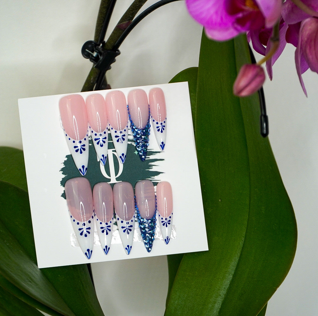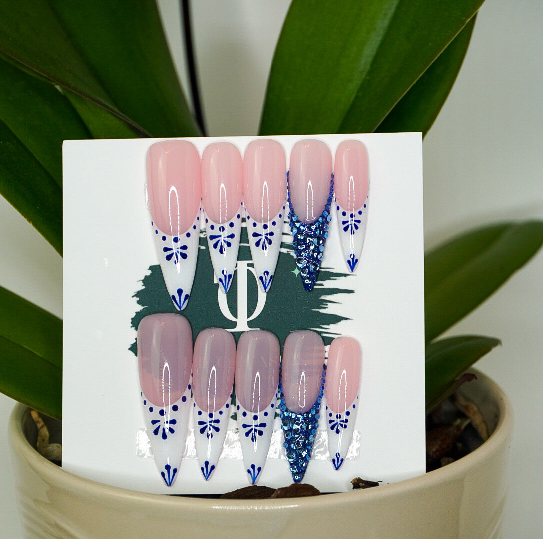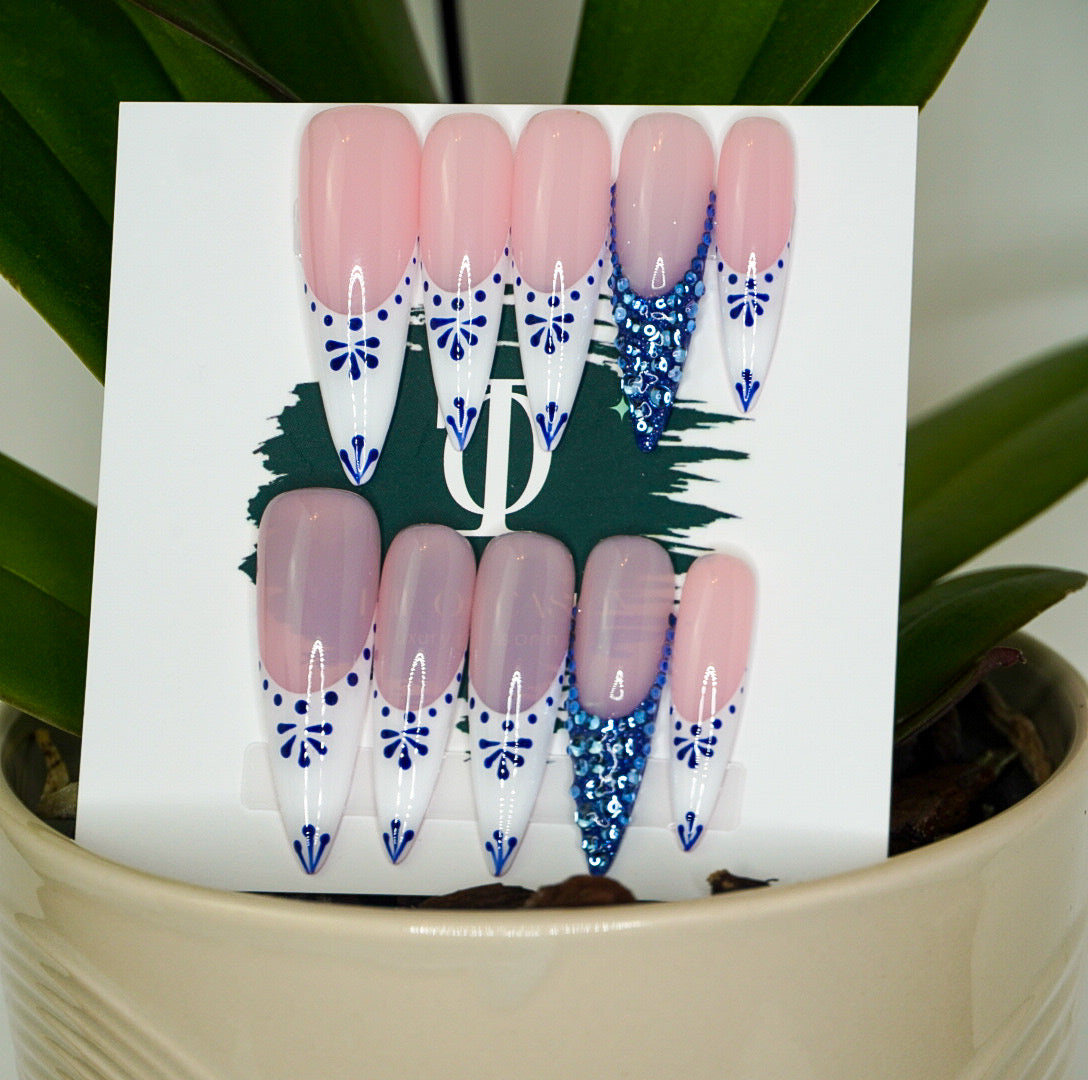 Long stiletto press-on nails feature a crisp white base with hand-painted blue graphic linework for a bold, artistic edge. One accent nail is fully embellished with blue rhinestones, adding a dazzling touch of glam to this statement-making set. Inspired by the elegance of the Clase Azul tequila bottle.
