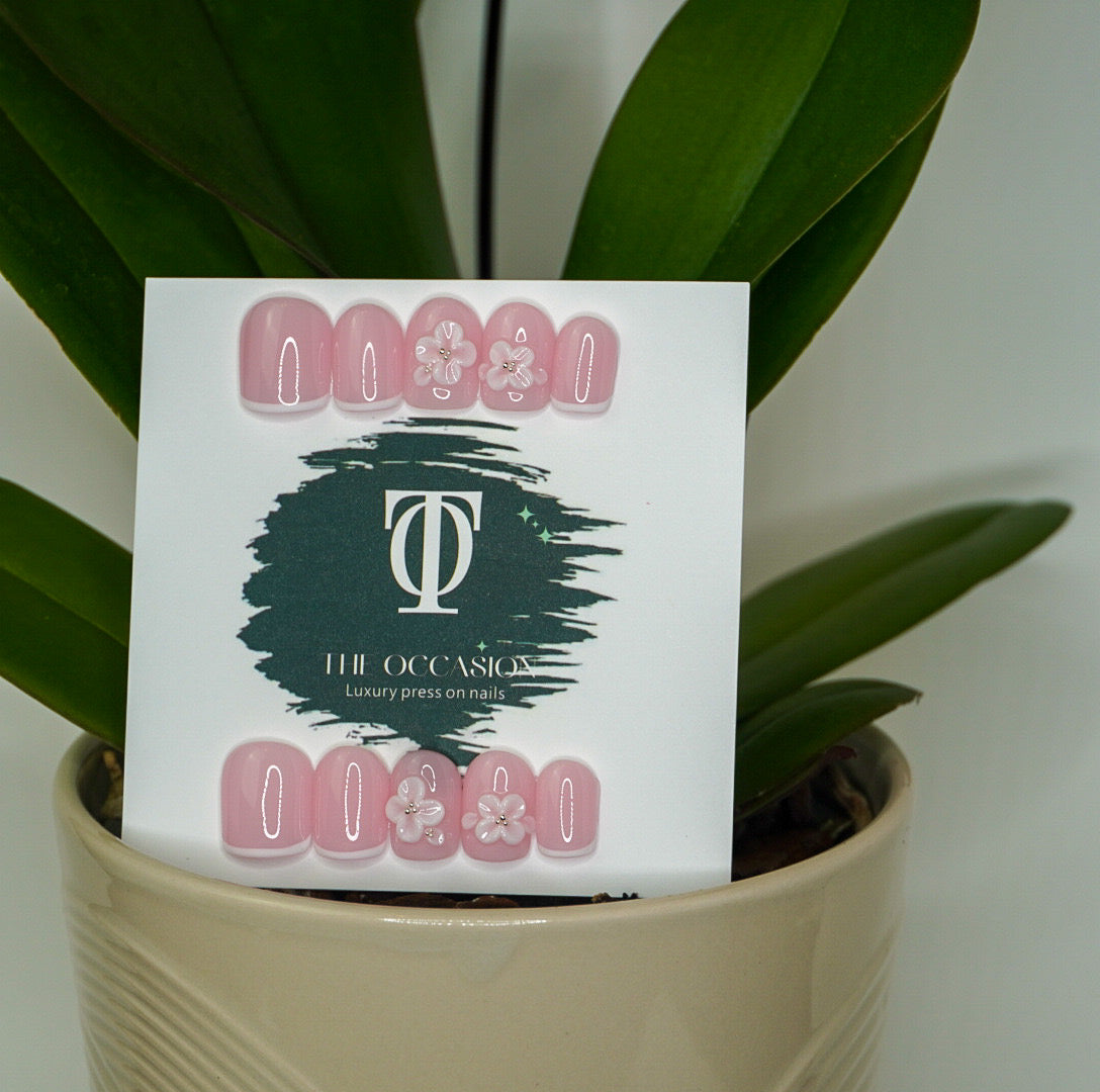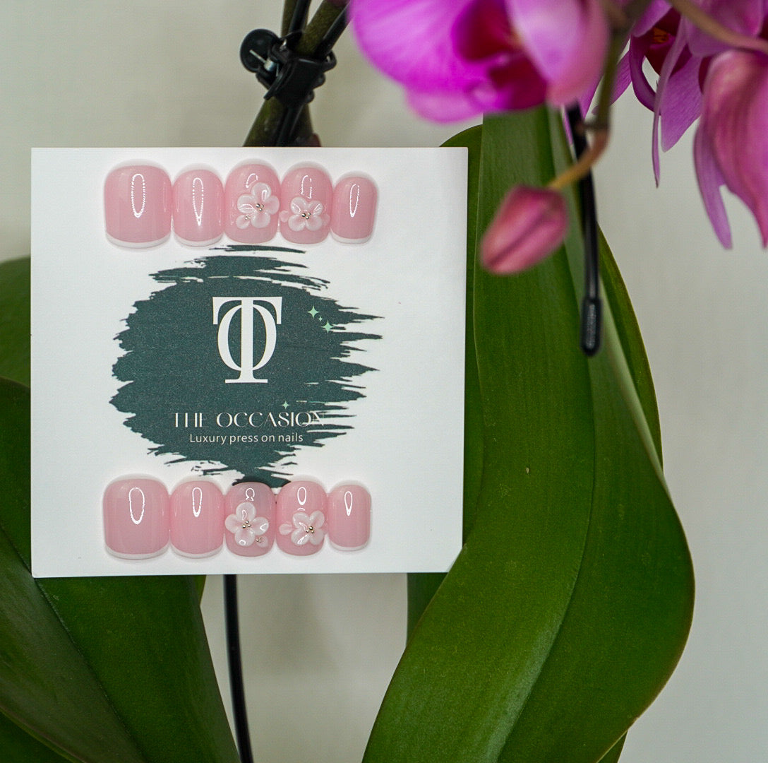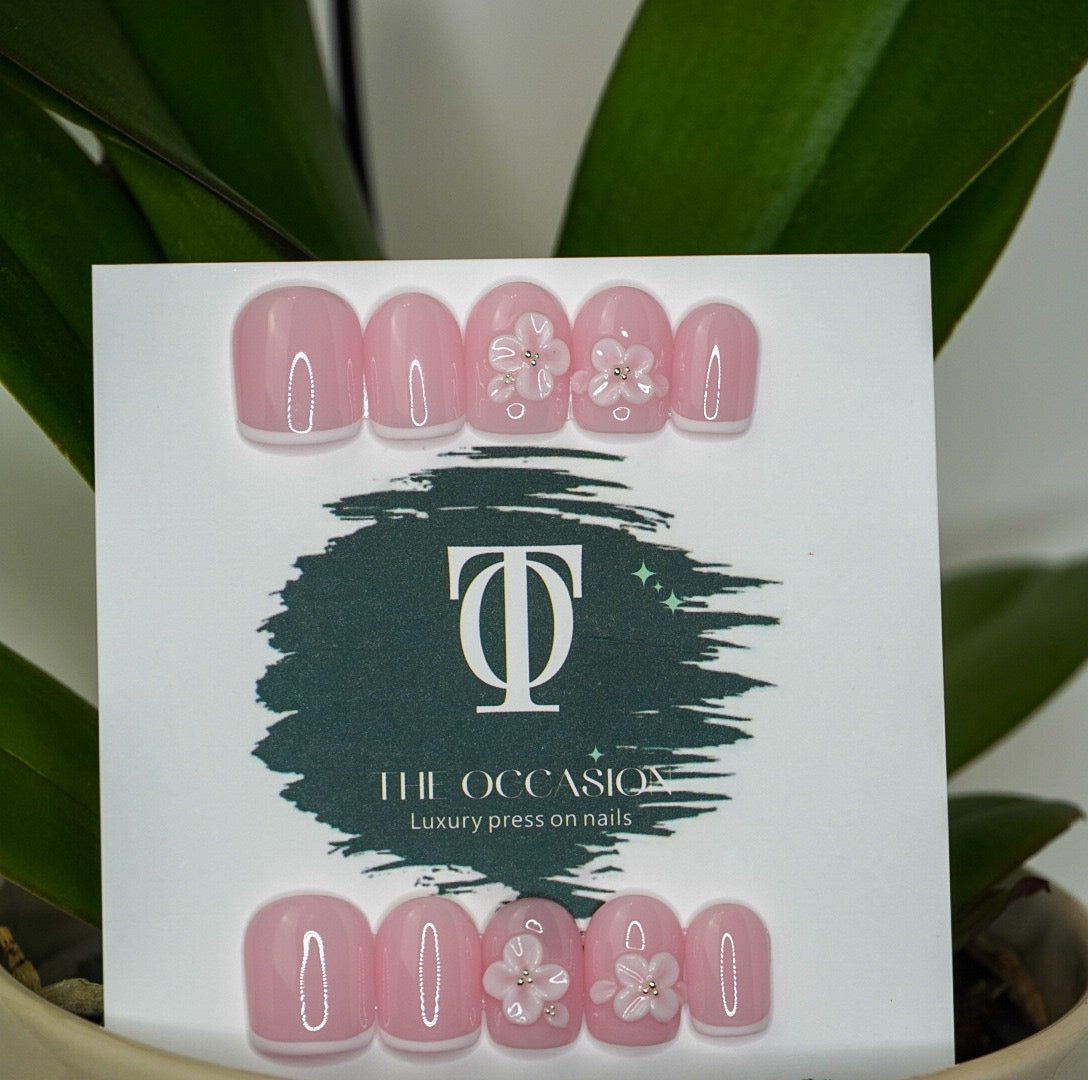 Short square press-on nails, featuring a timeless French tip design and two hand-crafted 3D flower accent nails. Each nail is designed with a soft, natural pink base for a clean, elegant look that mimics a salon-quality manicure.