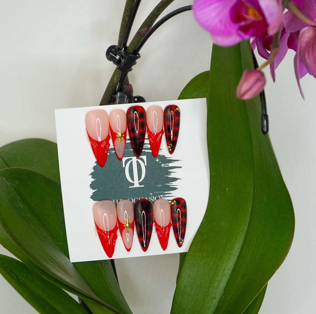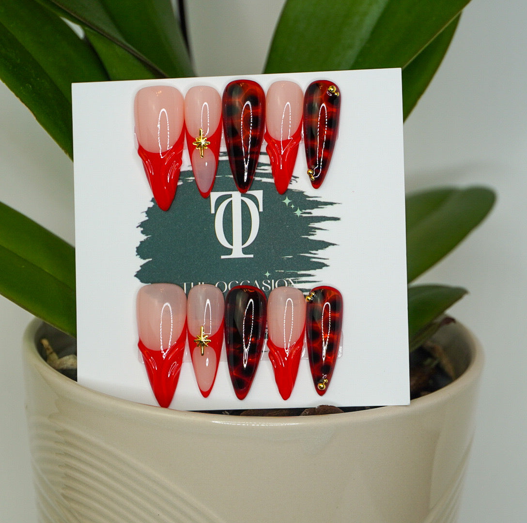 Unleash your wild side with these long stiletto press-on nails, combining fierce design and high-glam details. The set features two full cheetah print nails, trimmed with bold red lines and tiny gold studs for added edge. It also includes two red French tip nails with raised 3D gel lines, and one striking accent nail with a red tip and single gold gem at the center the perfect blend of bold and luxe.