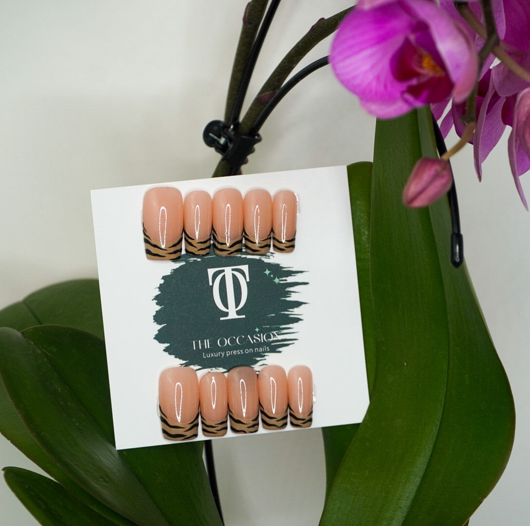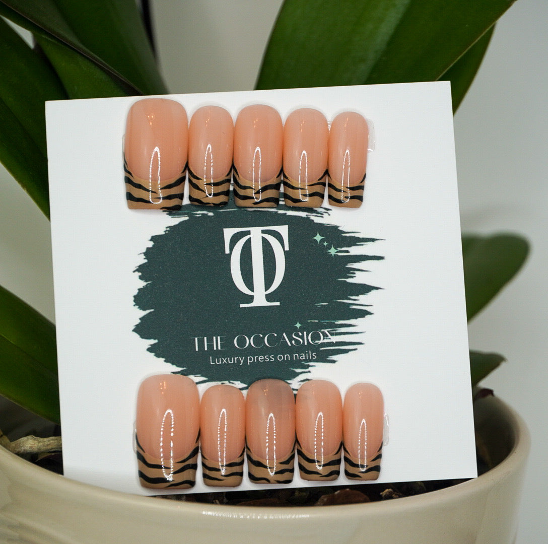 Short square press-on nails feature a classic nude French tip base with a bold twist—zebra stripe accents that add a modern, eye-catching finish. It’s the perfect blend of minimalism and statement style for everyday glam or a chic night out.
