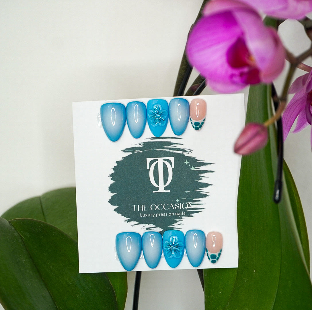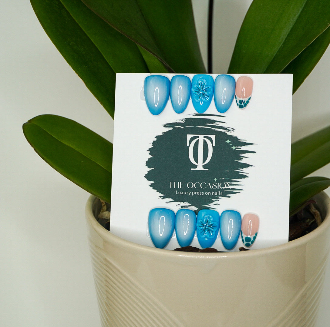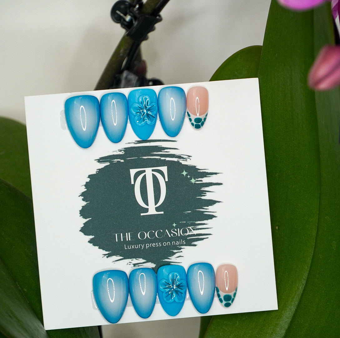 Elevate your manicure with the Yachting press-on nail set, soft and whimsical, this short oval press-on nail set features a dreamy mix of white and blue ombré nails, a bold solid blue accent nail adorned with 3D clear flowers, and a playful French tip nail with delicate blue dot detailing. It’s a fresh, feminine look that blends seasonal style with hand-crafted detail.